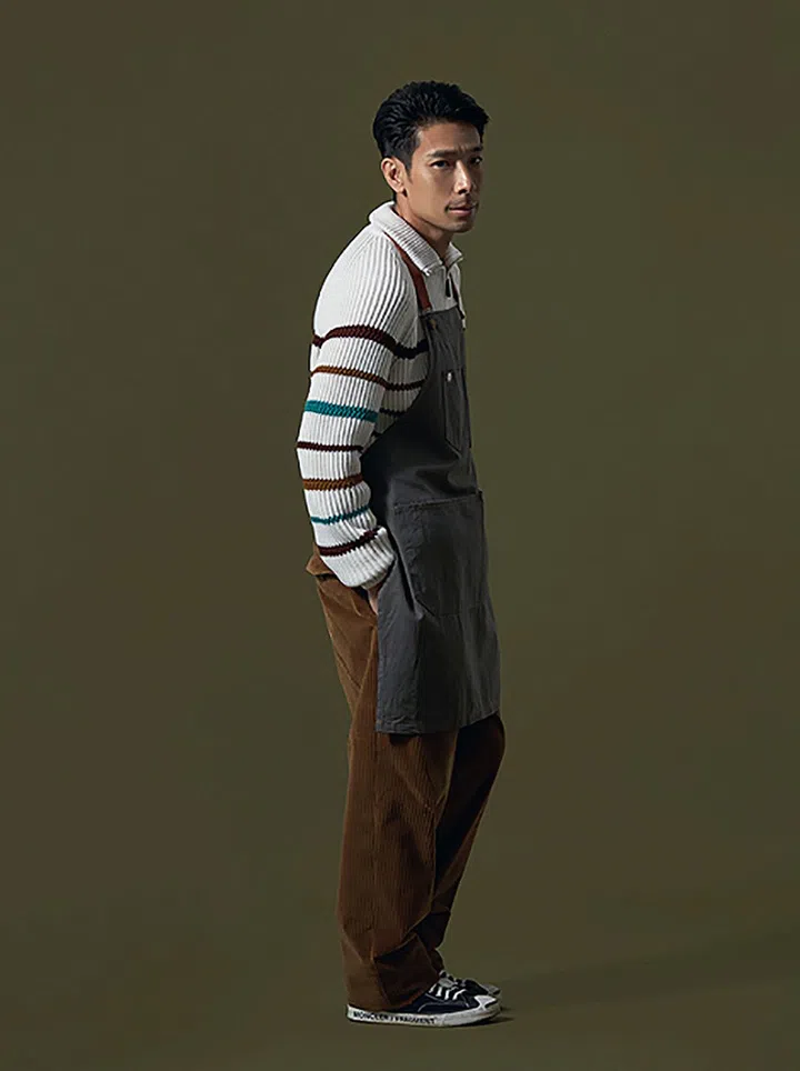 Loro Piana 针织羊绒套衫、 灯蕊绒长裤, 人物专属围裙、帆布鞋