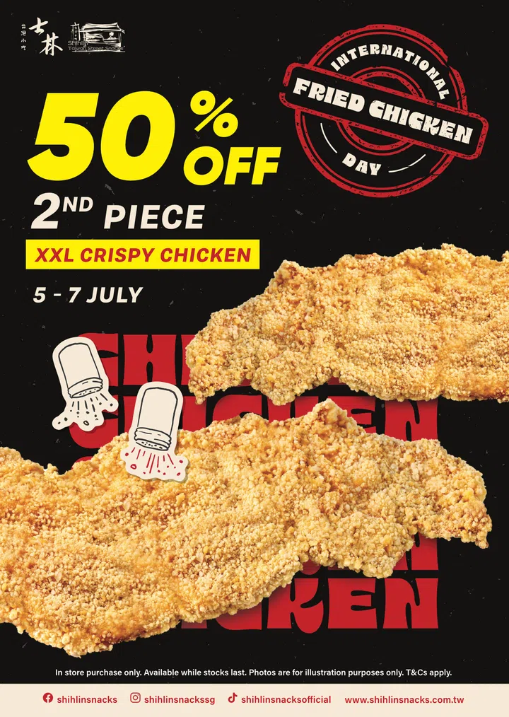 7月是与士林台湾街头小吃共同庆祝对炸鸡热爱的月份!从7月5日至7日,购买士林金黄酥脆的XXL 超大鸡排,第二份即可享半价优惠。士林鸡排以其诱人的味道和脆口闻名,每一块都炸得金黄酥脆,外酥内嫩,搭配独特的调味料。只能说,一块绝对不够!