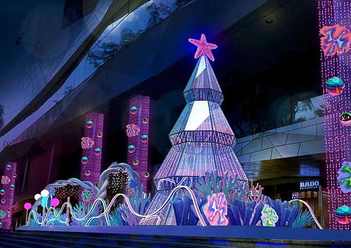 今年Wisma Atria携手Lasalle College of the Arts的学生,以水下世界为主题打造设计感十足的圣诞装置。