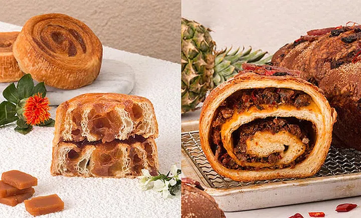 知名的意式连锁餐厅Da Paolo Gastronomia也加入新年‘战局’,带来一系列中西合并的糕点伴你庆祝龙年!创新的年糕可颂将“糯叽叽”的年糕,巧妙地融入可颂里。另外还有餐厅特别研发的Bakkwa Pineapple Dragon Bread,灵感取自夏威夷披萨,牛奶面包里添加了蜜饯黄梨、自制番茄酱、烟熏肉干还有芝士、最后再撒上辣椒。