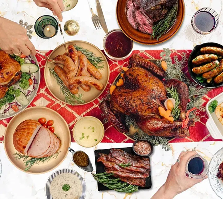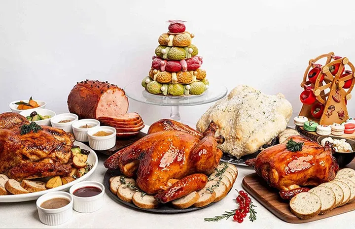 在Swiss Butchery,你可以找到价格从$88起的丰富圣诞套餐(适合2至4人),包括嫩滑的烤鸡配香料填料、香甜的整只蜜汁烤火腿、多汁的香肠和浓郁的蘑菇汤。如果你需要招待更多宾客,可以选择豪华的圣诞家庭盛宴套餐,其中包含金黄酥脆的整只烤火鸡、鲜嫩多汁的烤牛肋眼、香气扑鼻的香槟火腿、香脆的培根等美味佳肴。