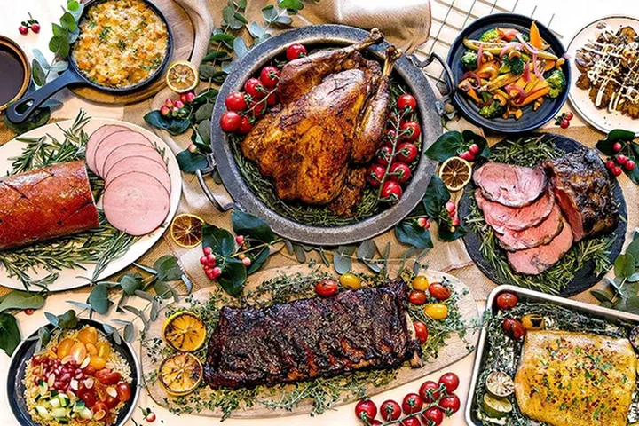 价格:火鸡,$245起;烤猪鞍肉,$230起;爱尔兰汉普郡猪排骨,$175起;烤龙虾焖意面,$255起;烤香草比目鱼,$225起;蛋糕,$90。