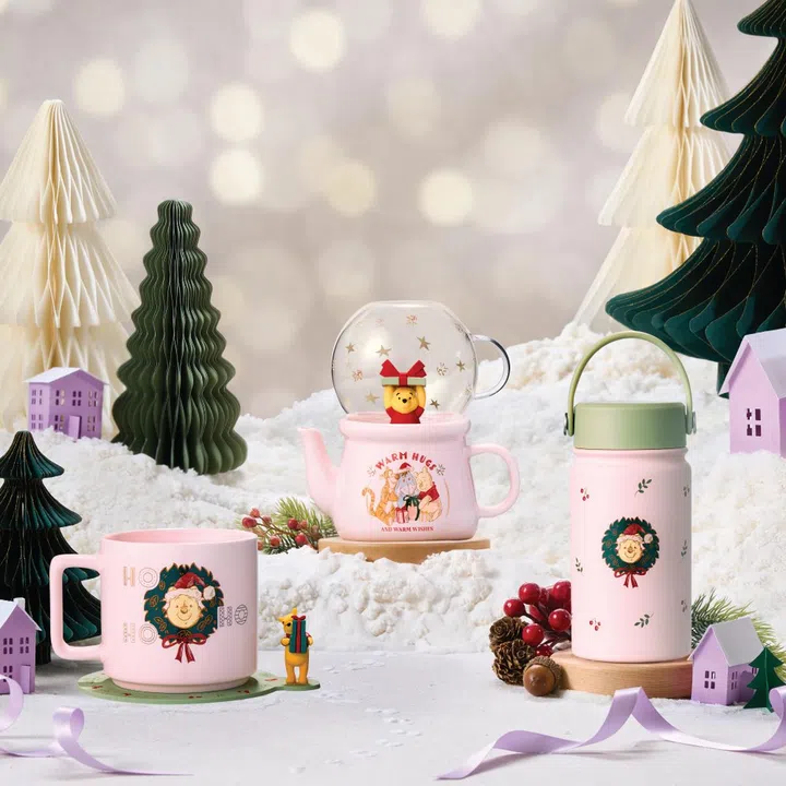 The Coffee Bean & Tea Leaf的周边商品一直深得人心,尤其是与Winnie the Pooh的联名款,每次合作都让人充满期待。今年圣诞季,他们又一次带来了惊喜——限量版的Winnie the Pooh茶具套装!这款套装包括一只粉色陶瓷茶壶,盖子上装饰着一个可爱的3D立体Pooh,笑容满面、手捧礼物,搭配一只玻璃杯,仿佛让整个茶时光都变成了一个小雪花球。这次圣诞系列不仅有茶具,还有保温杯($29.90)和马克杯与杯垫套装($24.9)),每一款都充满了节日气氛。