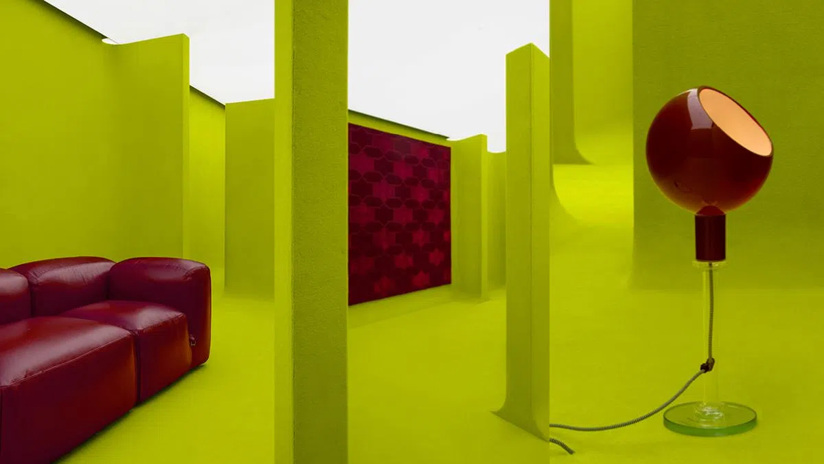 展示厅内采用了Sabato De Sarno所挑选的弧形绿色墙, 用以模糊边界和打造抽象空间。分开展示的物品各别呈现出独立概念, 让观展者亲自体会超越物品本身的思想和表达。以结合设计、建筑、雕塑和舞台布景等不同媒介而闻名的Guillermo Santomà解释: “若将展品放于同一空间, 就会形成一个普通的客厅景观。为打破并脱离物品本身的意义和功能, 我们以悬浮方式展示, 突出物品的形态、材质和色调。”
