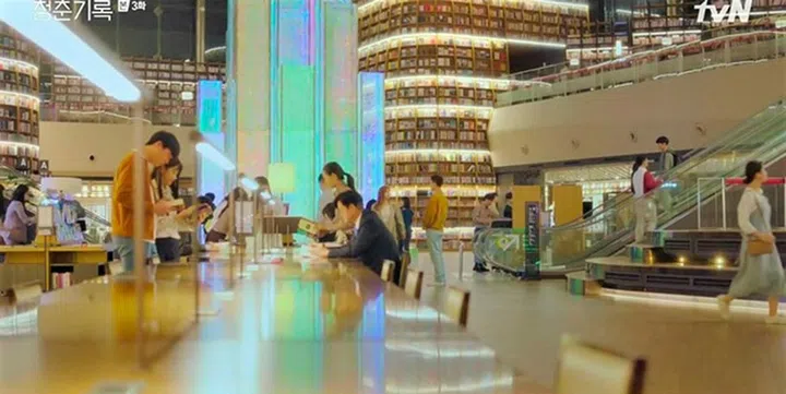 韩剧里往往连图书馆都格外浪漫,而《青春纪录》中慧峻(朴宝剑饰)与正河(朴素丹饰)甜蜜约会的“星空图书馆”(Starfield Library)便是其中之一。这家图书馆环境宽敞,四周都有打上了灯光的巨型书架,仿佛无时无刻都充满仪式感,并且还特别上镜。