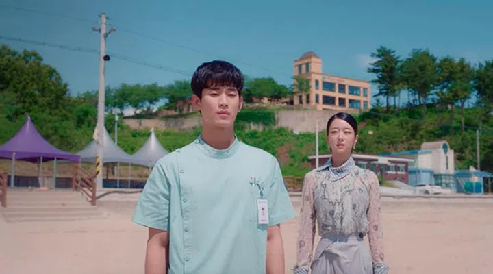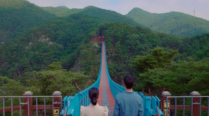 剧中出现的悬索吊桥、疗养院、沙滩等,其实都取景于江原道。其中的“小金山悬索吊桥”还被誉为韩国必打卡的100大景点之一,红蓝配色映衬着底下的绿油油的树冠,画面惊悚又莫名的具有童话气息。