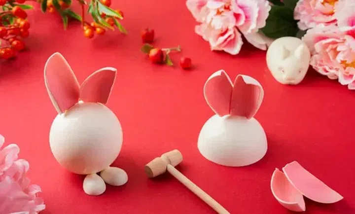 本地甜点女王Janice Wong也带来灵巧萌系的兔子甜点!吃法也相当好玩,以附带的迷你木槌敲开它,内层是裹上巧克力的坚果,一家大小共享,过个甜滋滋的金兔年。