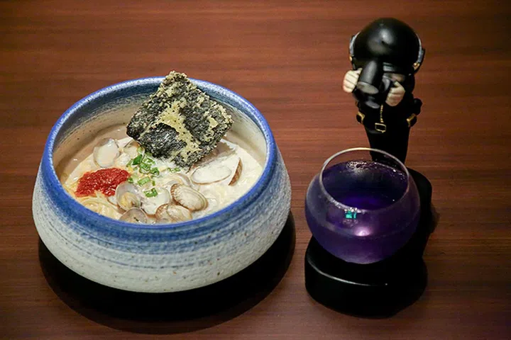 除了梅酒、鸡尾酒和居酒屋小吃,梅酒吧提供各式拉面,如:辣味蛤蜊拉面、招牌名古屋干拉面等,此外食客还能尝到河豚炸鸡和海胆可乐饼。