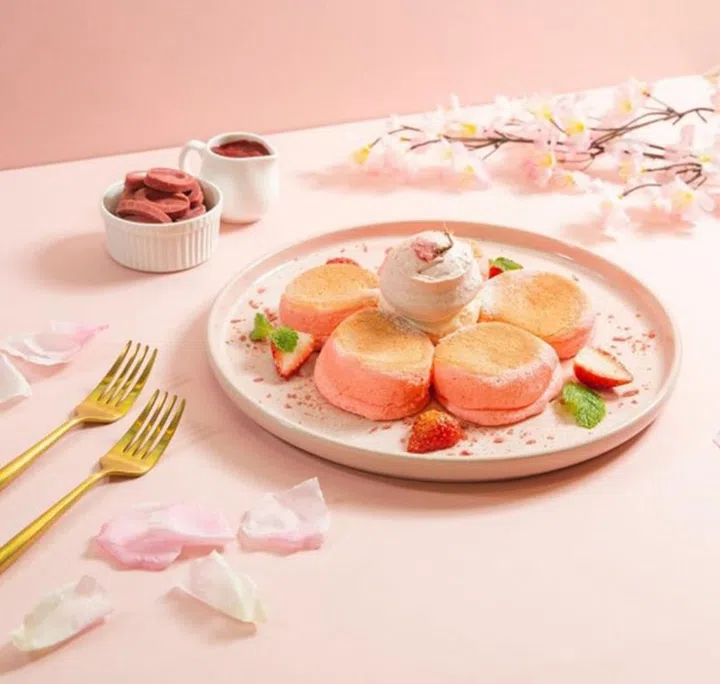 源自日本东京的舒芙蕾松饼名店,Flipper’s Singapore限时推出樱花主题的Sakura Kiseki edition ($26.80)。每份共有5个超粉嫩的舒芙蕾松饼,配搭店家特制的麻糬,内层包裹着香草冰淇淋,缀以红宝石巧克力奶油、干樱花瓣、千岁特产的香甜草莓,再撒上草莓粉,充满粉嫩甜美氛围。饮料方面也贯彻樱花主题,选择有Iced Sakura Milk ($7.90)、Hot Sakura Matcha ($7.20) 和Sakura Soda ($8.20),满足不同需求!