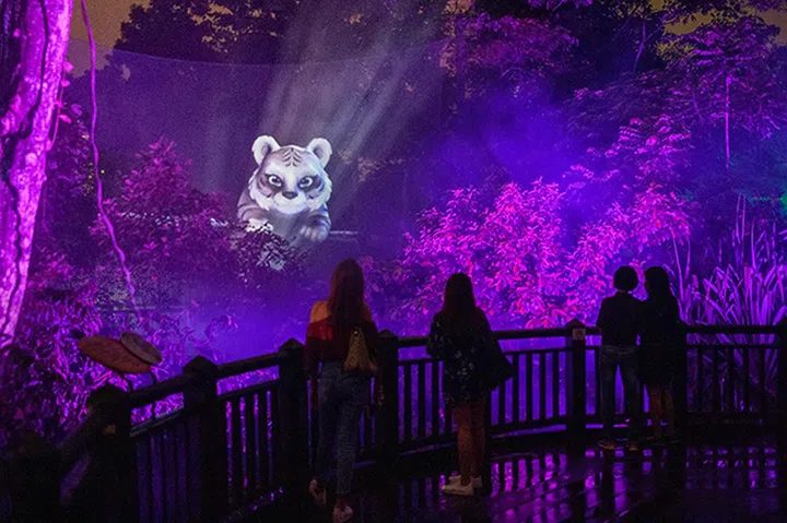 长约1km走道上设有10个互动区,在夜间雨林中打造出一场视听盛宴