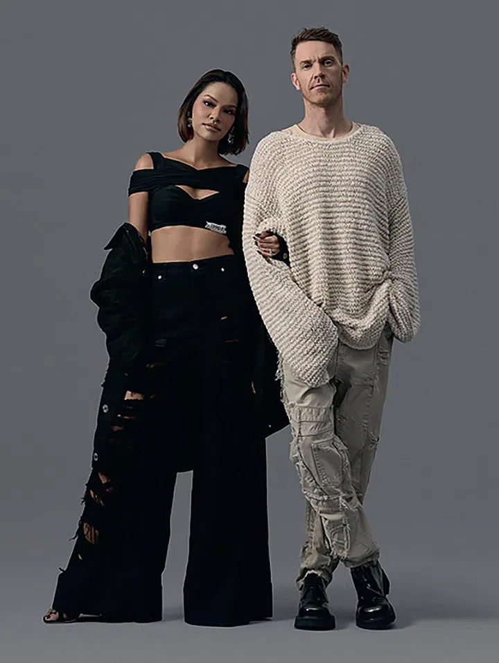 (On Sabrina) Dolce & Gabbana加捻生丝胸衣、牛仔裤、牛仔外套, Roger Vivier水晶金属耳坠、镶水晶麂皮高跟鞋 (On Matthew) Dolce & Gabbana 棉质背心、针织棉及亚麻质套衫、牛仔裤,Kenzo皮革鞋