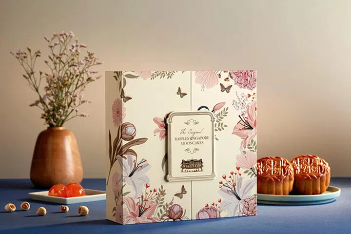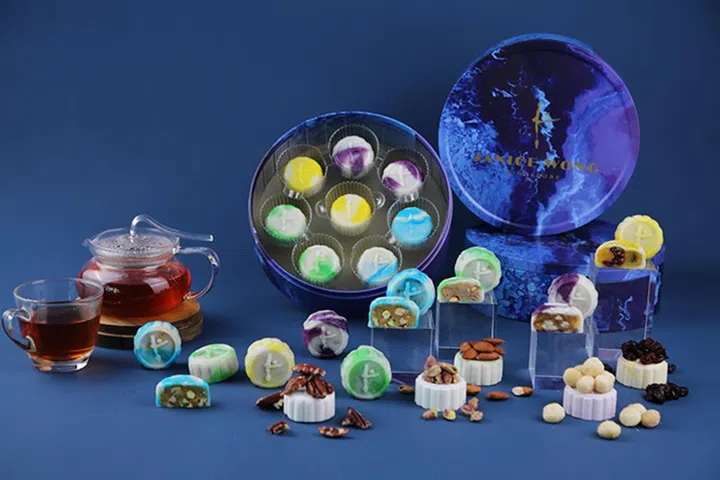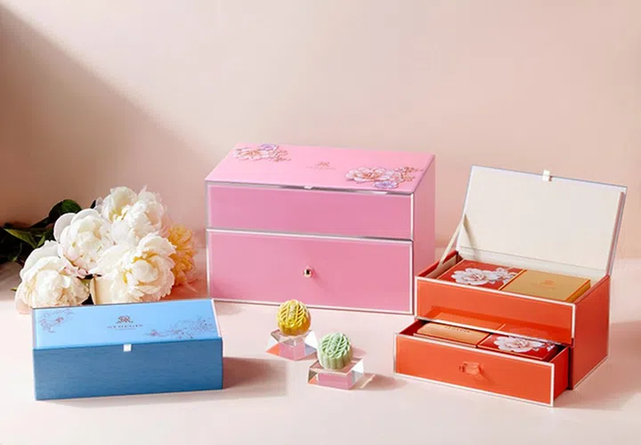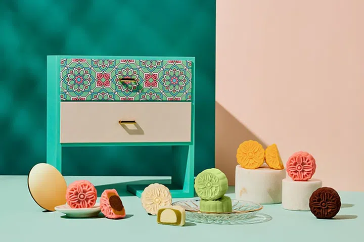 以娘惹风格为设计的礼盒,别出心裁又吸睛!抽屉式礼盒摆在桌上既美观又能用作收纳架,还有绿色Peranakan Teal及蓝色Blue Blossom两种设计可选择。这里的冰皮月饼口味也十分独特,如Snowskin Green Apple with Soju Truffle、Snowskin Milk Tea with Bailey Truffle、Snowskin Mocha with Chocolate Truffle及Snowskin Pineapple Cempedak,皆不是市面常见口味,适合喜欢尝鲜的人士。