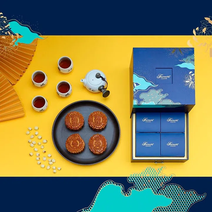 以深蓝色仿拟夜空,绘上浮云与星河,Fairmont酒店的月饼礼盒精致不失童趣,典雅而充满现代感。抽屉式礼盒也为“开箱”增添仪式感,4块独立包装的月饼也方便存放和食用。你可在双黄白莲蓉、单黄白莲蓉及纯净莲蓉之间,选择组合出4块月饼,礼盒中还包含茶具套装,自用可招待宾客,送人则体面周全,值得作为首选考虑哦!