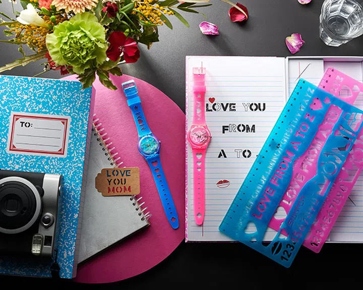 Swatch推出的母亲节特别腕表献礼,包括“粉红甜心”和(Love With All The Alphabet)和“爱无止境”(Love From A To Z)两种款式,配以夜光指针、闪闪发光的透明表扣;镂空“mom”设计和心形表带,则是从儿时的直尺设计汲取灵感。而且,腕表礼盒打开后还能看到Swatch复古直尺,给人回到校园般的美好回忆。