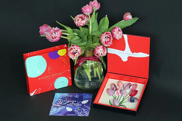 本地甜点师Janice Wong同名品牌推出的Tulip Cookies& Cream Chocolate box以多彩又精美的郁金香巧克力(单购价格 $51.40),搭配获奖花艺品牌Fiore Dorato的鲜花作品,绝对给妈妈带来美的享受。不过要记得提前3天pre-order哦,现在就赶紧下单吧。