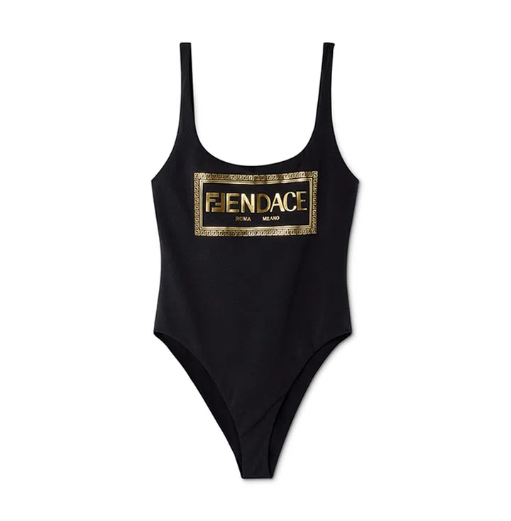 来自Fendi及Versace互换设计师的合作系列Fendace,正面为“Fendace”合体logo和结合FF图案及希腊回纹的标志,背后装饰金色Medusa图案。