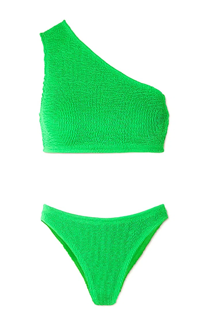 醒目的BV绿及愈发流行的单肩设计,泳裤coverage适中,略带褶饰的面料也让你穿得更加舒适、自在。搭配chunky sandals穿着,更有年轻态度。