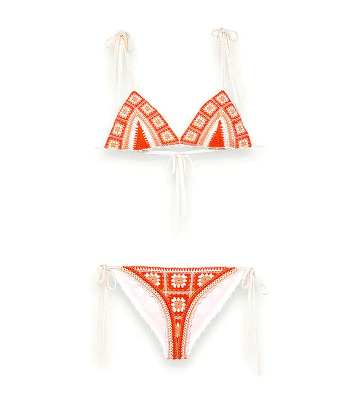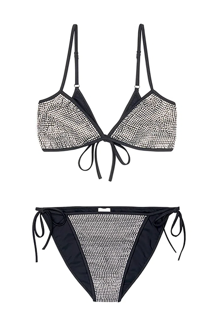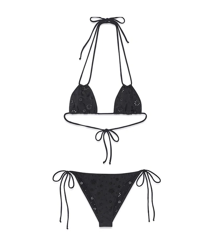 Broderie镂空网眼设计的比基尼泳衣,性感中带有一丝甜美和可爱。搭配同款系带比基尼泳裤,让你的黑色泳衣造型显得俏皮又年轻。