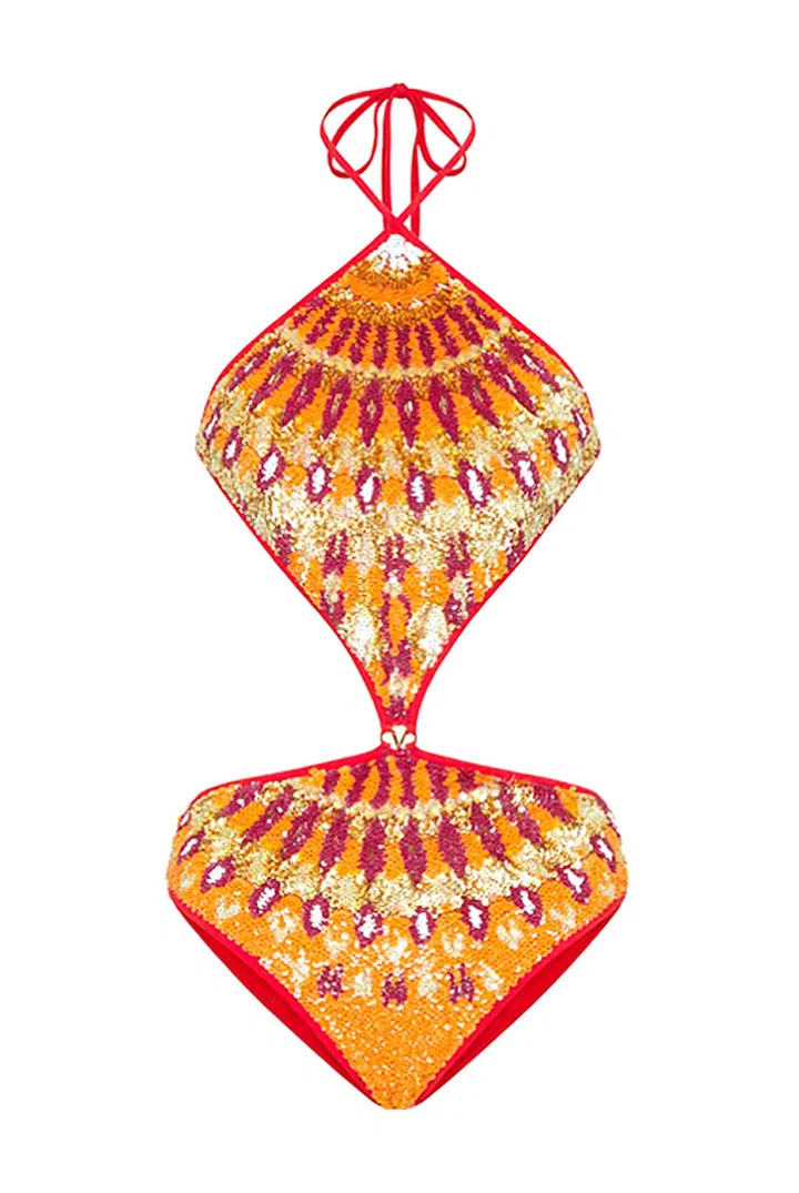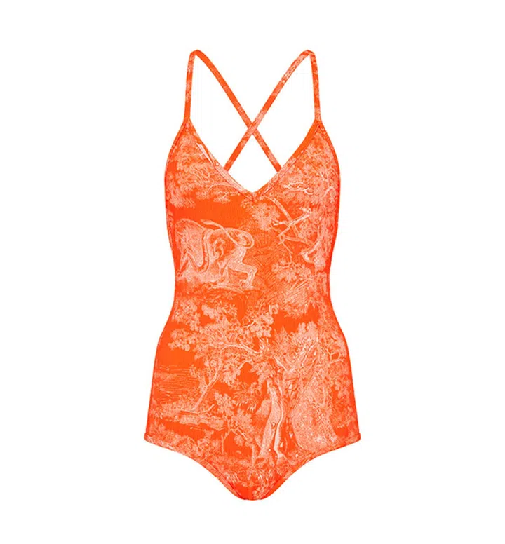 来自Dior全新推出的Dioriviera胶囊系列,泳衣上装饰精美的Toile de Jouy印花图案,背后为大露背交叉肩带设计。除了亮橙色外,也有醒目的亮粉色及矢车菊蓝色可选。