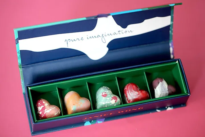 情人节还是喜欢收/送巧克力?那么本地巧克力达人Janice Wong的情人节限定,别错过了。今年的“情人”口味包括橄榄油、柑橘、抹茶、椰子和柠檬香草,搭配Janice招牌的“彩绘”,每一颗“心”都赏心悦目。除了5颗装,还有9颗装($42)可选。
