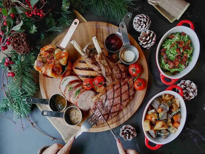 牛肉专家Black Marble则推出了两个丰富的拼盘供选择,The Joyeux Noel Platter ($198,适合双人)包含汤品、芝士前菜、挪威三文鱼、澳洲MB5牛肉、火鸡,还有其他小菜、蘸酱及甜品。