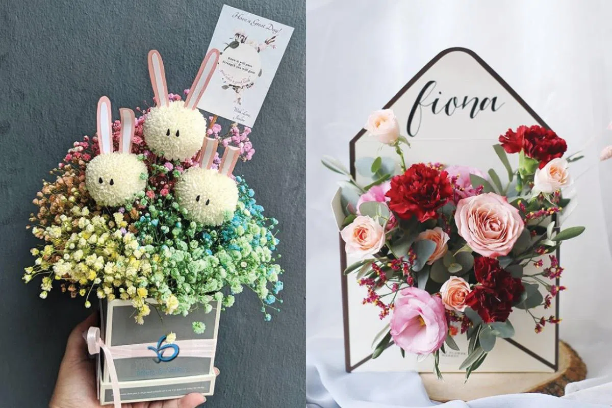 三只花球小动物,搭配缤纷的满天星做陪衬,是不是特别萌!值得一提的还有以盆栽装盛的呈现方式,让女友在收到后不必花费心思找容器,又省去一大烦恼。各种陪衬花卉可自行定制,价格从$42起,需送货服务则要添加$8。