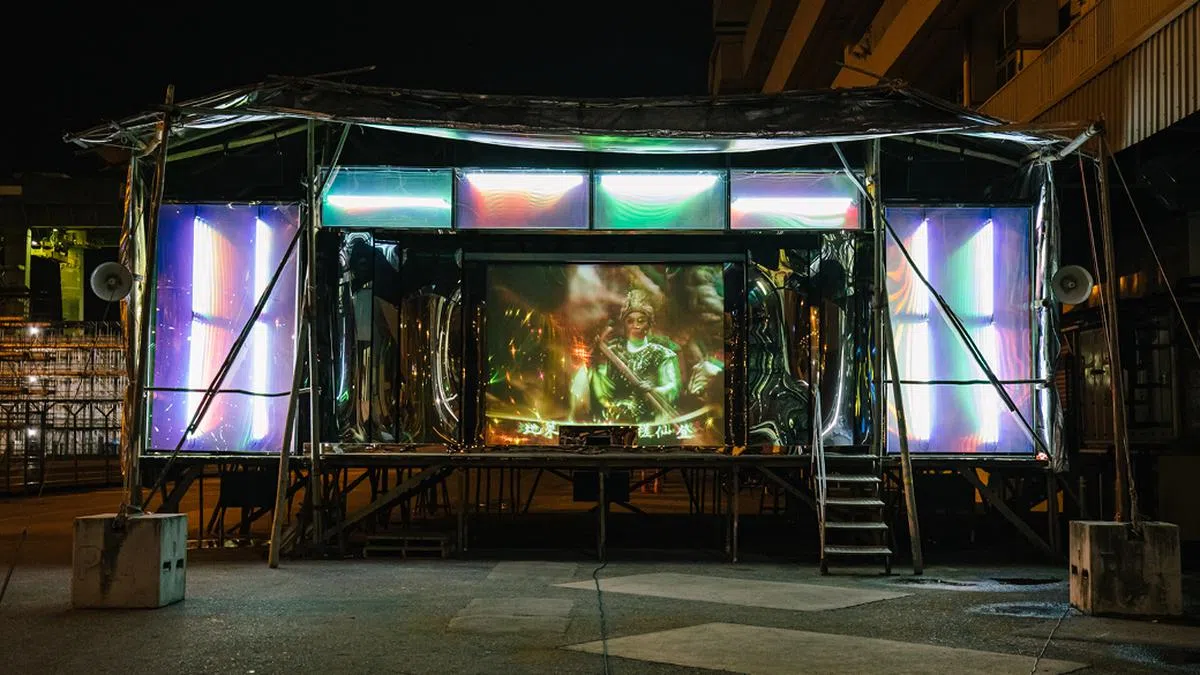 传统戏曲碰撞科幻感太空梭,古老和未来集于一身。场地设在SAM at Tanjong Pagar Distripark(新加坡美术馆丹戎巴葛分销园)新展馆的户外空间,与旁边的集装箱码头相映成趣。