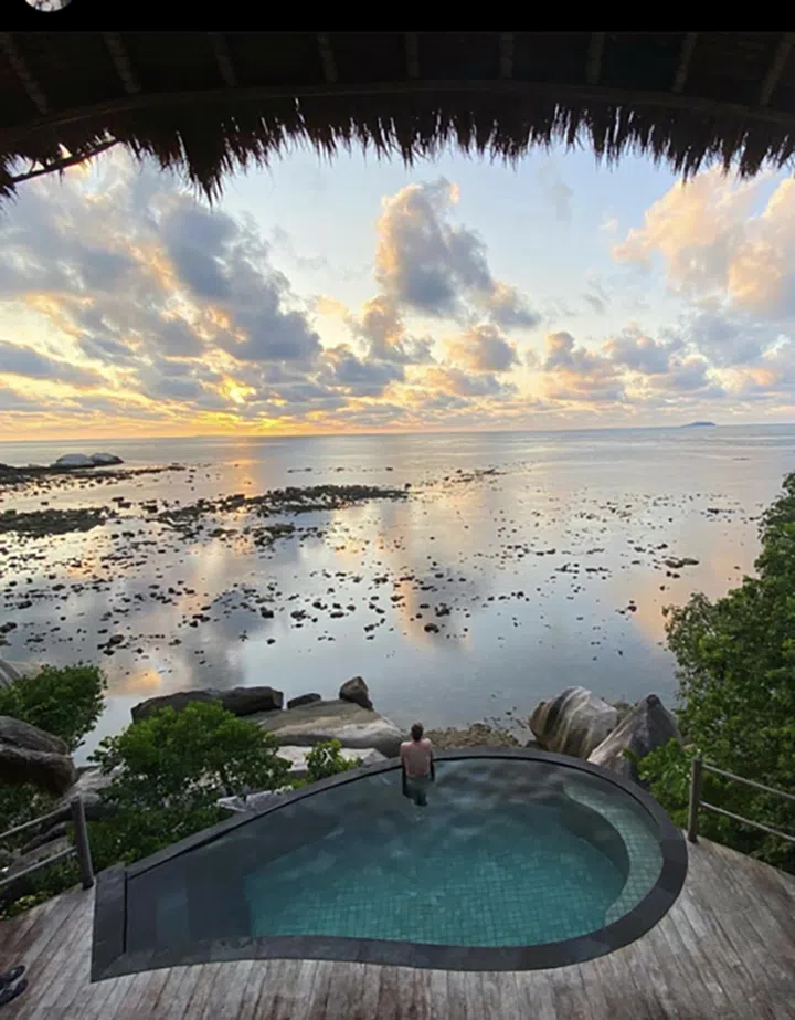 李心钰分享老公的背影照,景色怡人。从Tanah Merah渡轮码头出发,2.5小时后便会到达90公里外的Cempedak私人岛屿度假村,岛上有20栋别墅,每栋都拥有私家泳池和户外阳台,相当适合夫妻情侣周末小旅行。