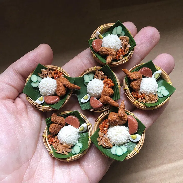 主要使用风干粘土(air-dried clay)和树脂(resin)为材料,制作过程不算复杂,但却十分耗时及考验耐心。如迷你“粽子”:我们会把真粽叶洗净后,再依照我们制作的模型进行切割,然后再把平常剩余的粘土当“内馅”包在里头。每件作品可能需要多个步骤或组件才能完成。