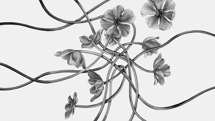 我的作品主要分两种:一是实用性插画作品,另一则是实验性个人创作。插画作品的核心主要来自于我对花的痴迷及对美感的最原始渴望,这类作品无疑较吸睛,多数是亮丽的花卉水彩图,得到不少顾客青睐之外也为我带来一些特别的商业合作项目。实验性个人创作则没固定表现形式,主要是为自身的表达。我偏爱用简单的黑白来呈现,构图也较抽象,且不拘于使用任何一种媒介。说实话,这类作品的受众群比前者小得多。