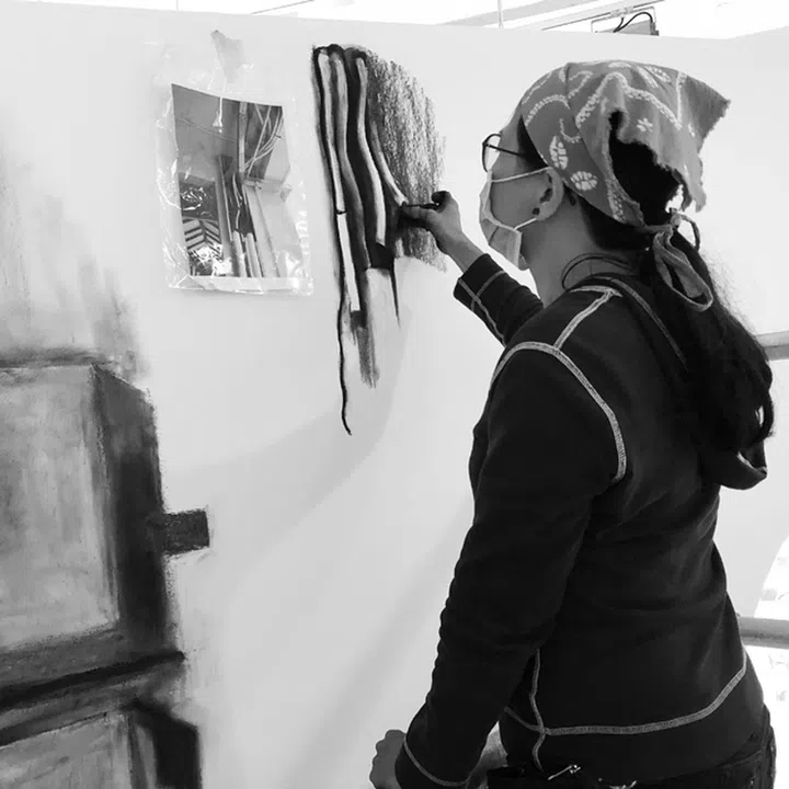 在LASALLE艺术学院选修了本地画家胡耀光的课,他鼓励我用最基本的绘画工具开画,我因此选了炭笔。自那时起,我便逐渐喜欢上它的淳朴和质感——喜欢它的黑,不像铅笔带有丝丝光泽度;喜欢将它握在手里画出各种线条,并直接上手涂抹出黑、灰、白的层次。它虽是小小一块木头,却可完美呈现光暗对比,画出不同空间和氛围,让我画出具张力的作品。
