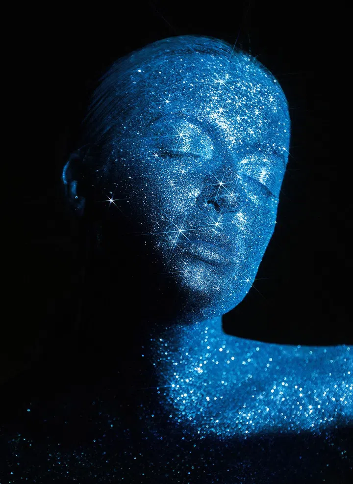 确实,哈哈!幸好这次为《女友》拍摄时只涂了头部和肩膀,若全身涂满就真的太有挑战性。因为要确保每个部位都覆盖到,最难受的是鼻子和嘴巴,因常不小心呛到却不能用手擦掉影响呼吸的闪粉。作为艺术家用这种材料确实会经过一番挣扎,但观众对我这种艺术呈现的反应却很好——他们的热烈反应让我觉得每一刻与闪粉“共处”都是值得的。