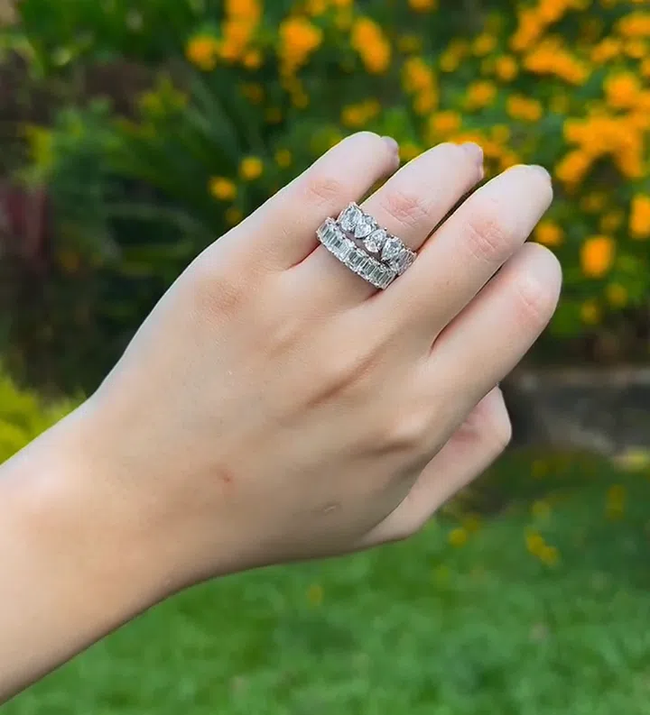 因为从小就对首饰情有独钟也热爱设计, 创办自己的首饰品牌就一直是我的梦想。早前的“求婚事件”成了我创办品牌的一大动力, 促使了可持续首饰品牌Rinn的诞生。我当时的男朋友(现已是丈夫)为了给我买梨形钻(天然梨形钻的价格很高)求婚戒而辛苦存了很久的钱, 让我两后来都觉得这笔钱可以用在更有意义的地方。我因此开始去钻研和了解实验室培育的钻石——虽然价格更合理, 但却没有我理想中的钻石切割, 所以就决定亲自设计。现在戴在手上的钻戒就是我设计的——2.25克拉的钻石象征我先生的生日, 旁边两颗小钻则组成我理想中的梨形, 象征我和我丈夫成为the perfect pear(谐音“pair”)。