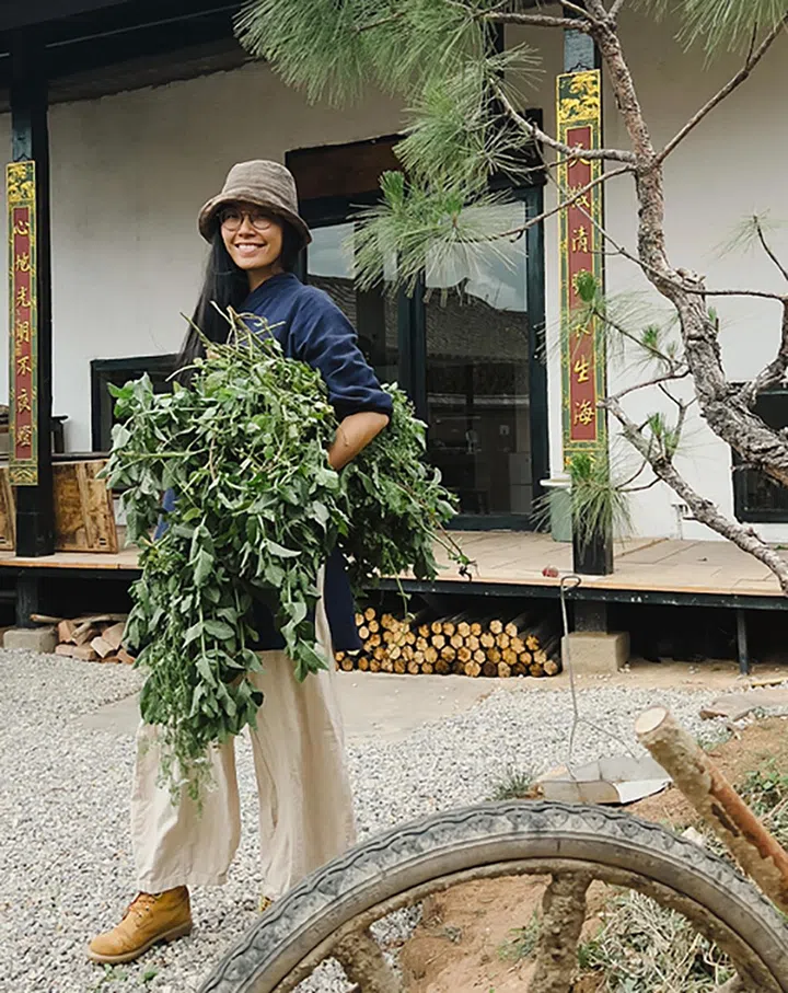 其实早在来沙溪两年前,我就开始反省并调整生活方式,学习各种手作和可持续生活,做起别人认为很“闲”的事。如下楼采集野草用它编成篮子,也接触并爱上草木染。某次我在Instagram上遇到一位朋友,上他微信朋友圈时看到有老师在沙溪招募草木染合作人。于是我立马加了老师的微信——我希望老师能教我染布技巧,而我愿意以摄影宣传的方式作为回报。因为那是我一直想体验的古法染——从大自然中采集染料,并结合当地雨水、土地等元素,让植物把色彩自由展现在织物上。在此生活一段日子后,我渐渐感受到留下来的召唤。约三个月后我做出人生中最大胆决定——放弃新加坡的一切,来这里重新开始生活。