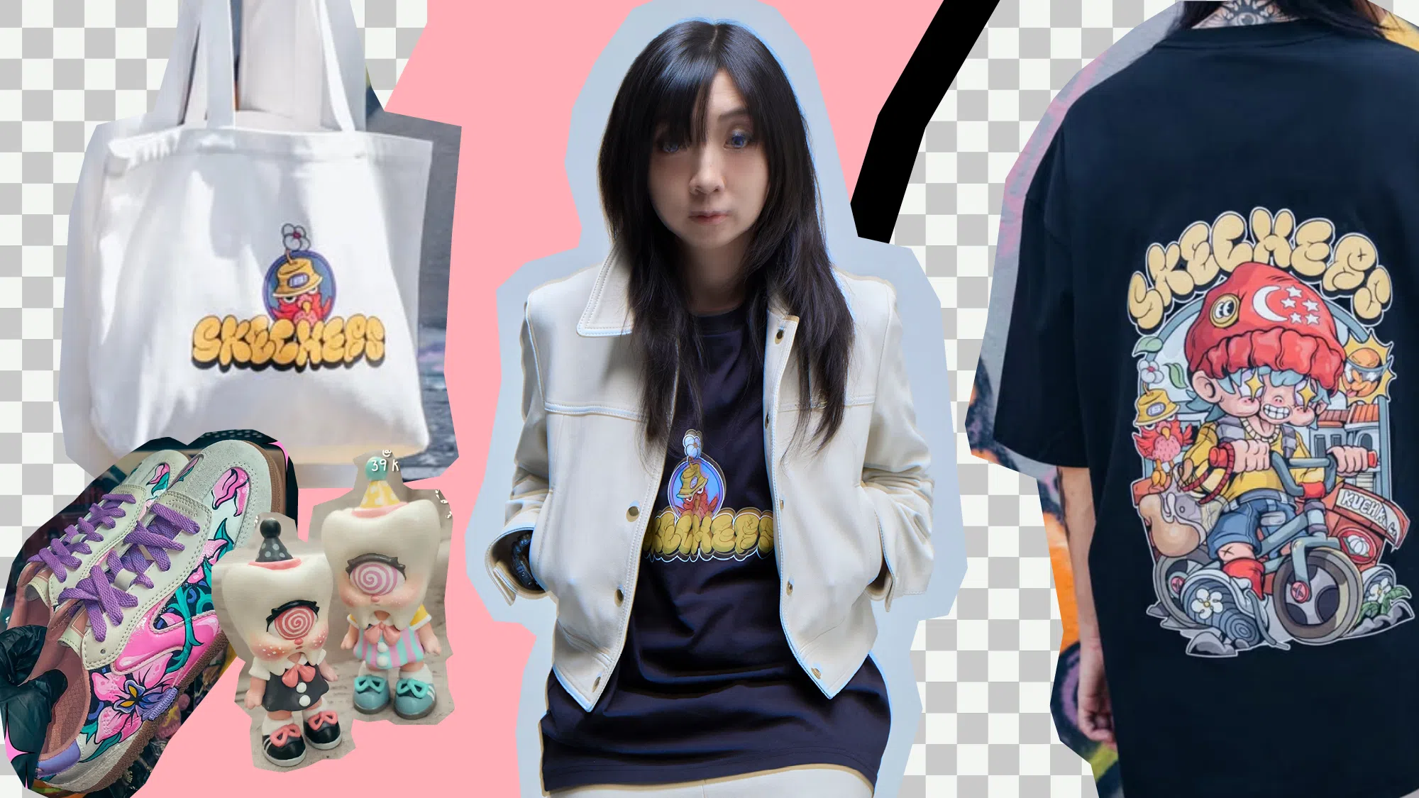 Skechers联名系列时尚单品展示,ERIKA TAY身穿印有卡通插画图案的黑色T恤(背面设计为戴新加坡红白帽的角色骑车图案)、白色托特包、彩绘运动鞋,以及两款独特的潮玩公仔。中央模特身穿印有Skechers联名Logo的黑色T恤,搭配浅色外套,整体风格融合潮流街头与艺术玩味。(图:《女友》拍摄)