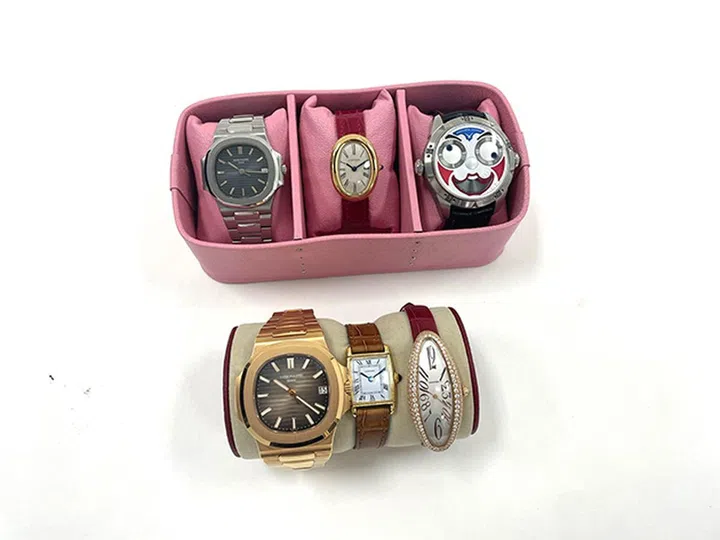 这些是Deborah与Stephanie的部分收藏。Deborah的收藏(上排左起:Patek Philippe 3800、Cartier Baignoire、Konstantin Chaykin Grimald),Stephanie的收藏(下排左起:Patek Philippe 5711 RoseGold、vintage Cartier Reverso、Cartier Baignoire Alongee Cortina 50th Anniversary)