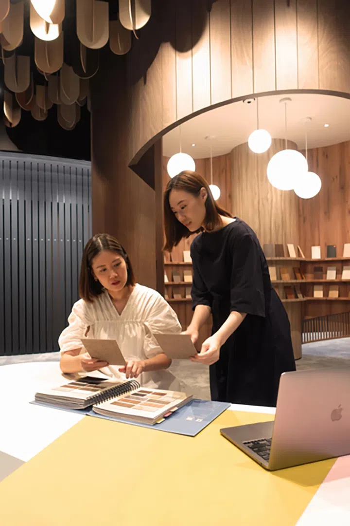虽然爸爸依旧是公司的决策者,但自我们加入后,他都给予我们很大的空间。如我们构思并打造的材料showroom,当时在业界可谓首创。我们把一栋建筑打造成像是“材料图书馆”的产品展示厅,你能经常