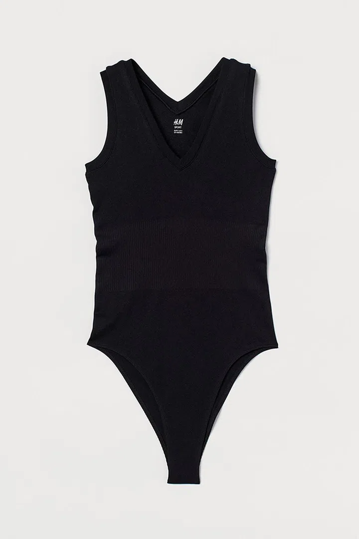 其实bodysuit用处多多,你还可以选择一件这样的V领的黑色简约款式。做低强度运动的时候,下身可穿一条运动短裤;平日里也可以用它搭配职场裙装及裤装,衣服既修身又不会乱移动。