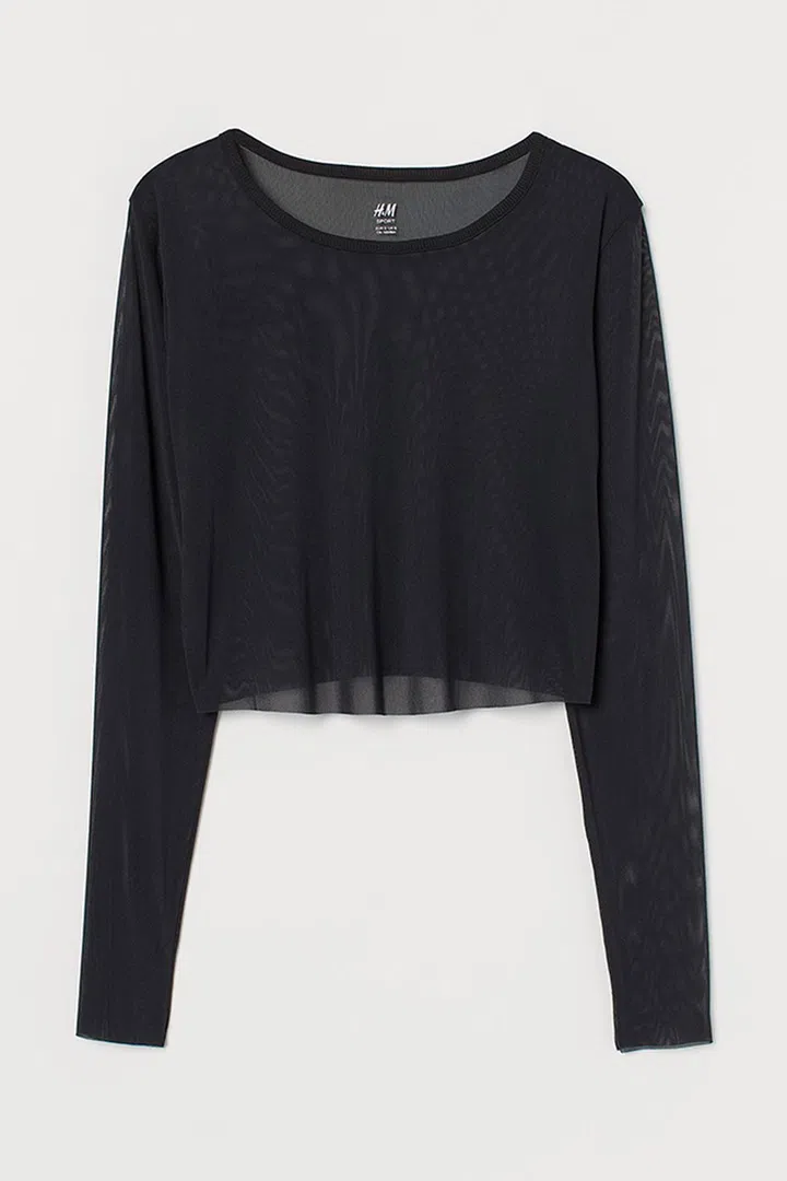 剪裁略宽松的短版薄纱上衣,运动时可以套在bra top外面(避免不自在或者“挡肉”),平时的用处也非常多,可以内搭在短袖衬衫里或穿在连衣裙里面制造层次感。当然,直接穿在黑色bralette外面也没问题。