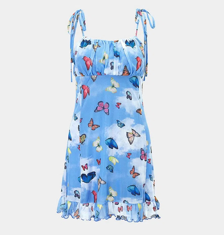 浪漫的蝴蝶元素,韩星造型中也经常出现(请看Rosé最近的“花仙子”造型,及明星的“蝴蝶效应”)。这款蓝天背景的印花连衣裙,图案抢眼又入时,也应该会卖得很快哦!