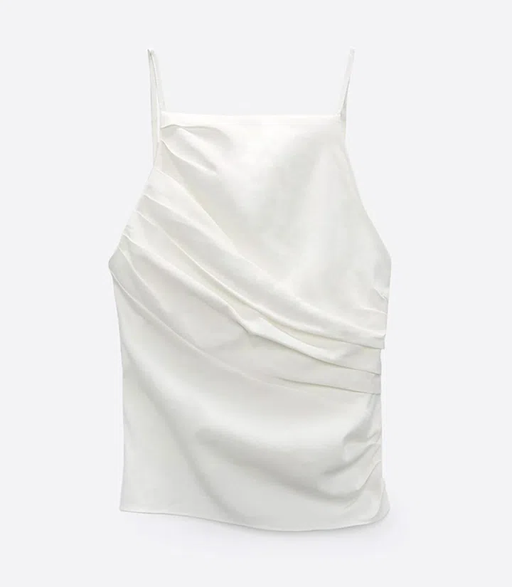 这款白色褶饰吊带(露上背部)可搭配同款褶饰开衩裙,一起穿着时如连衣裙般具有一体感,同时又能方便地拆分搭配,非常实穿。