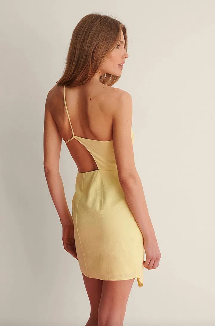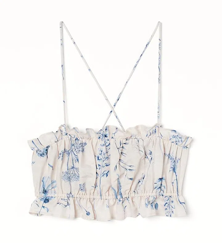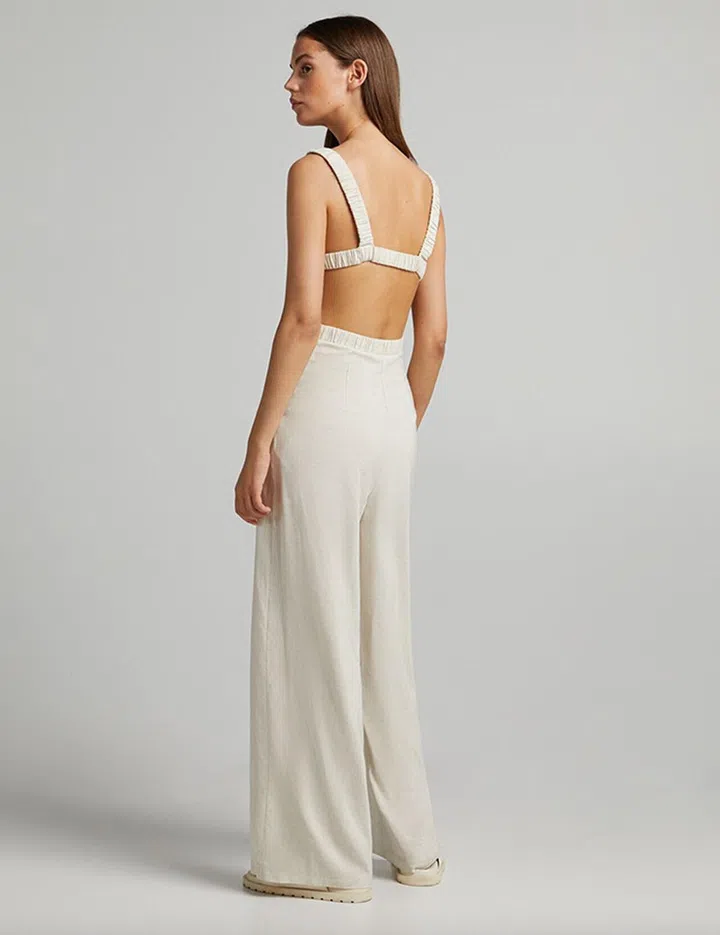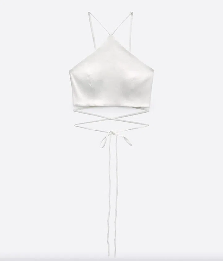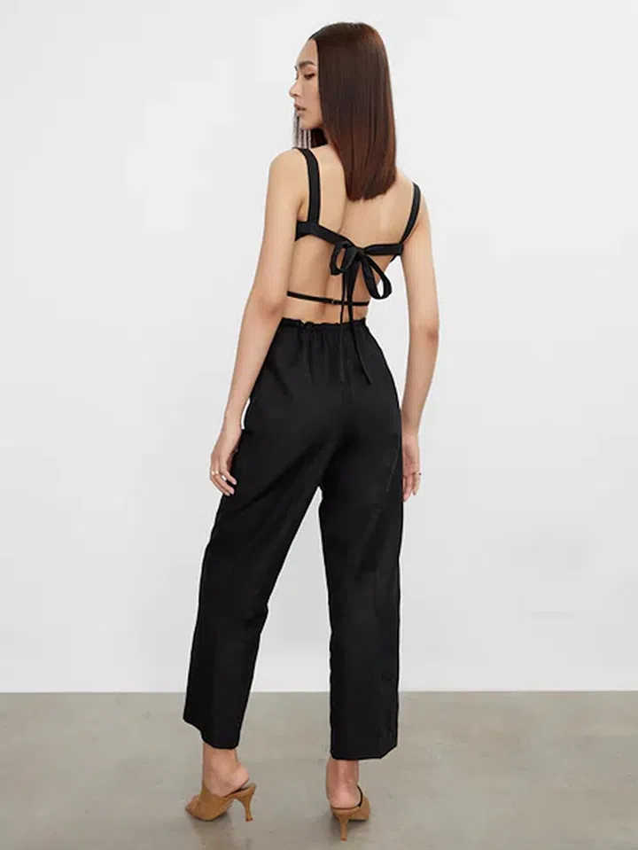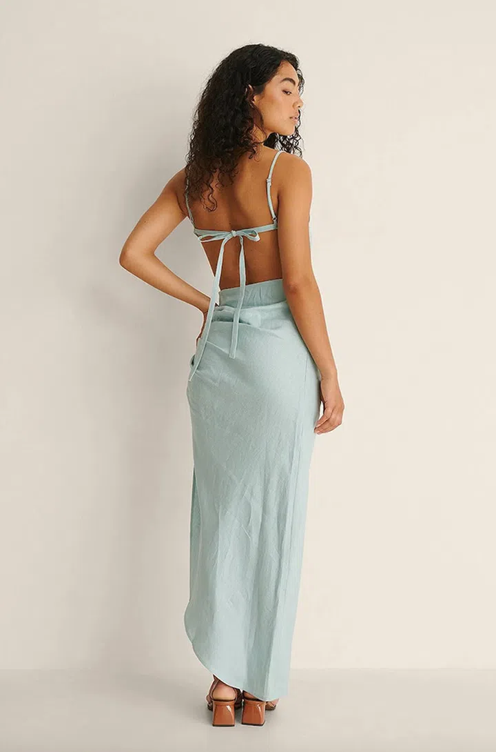 纤细的肩带挂在颈项上,并在腰间缠绕打结,优雅露出上背部及后腰部位,造型妩媚又简练。可搭配这款亚麻混纺立体剪裁开衩裙穿着,更显身段!