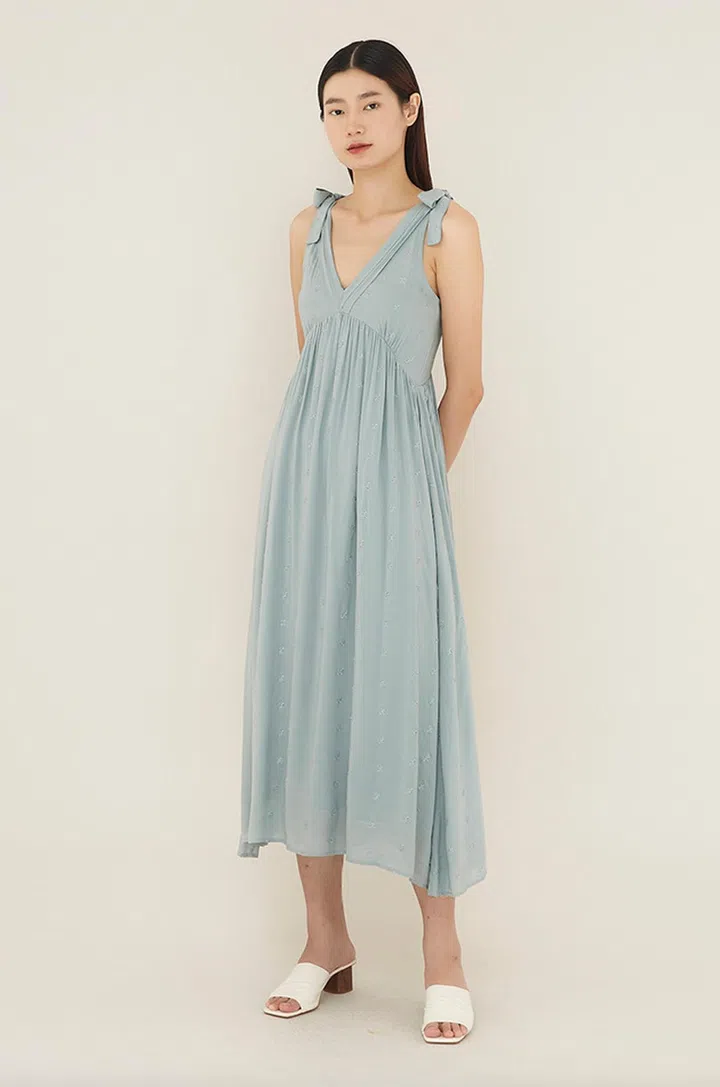 青苹果般的色调,也能有效衬托出可人的肤色。V领设计结合收腰褶皱,剪裁上可隐藏小腹,也能在视觉上修饰、美化胸型。
