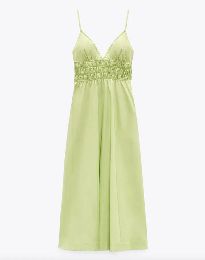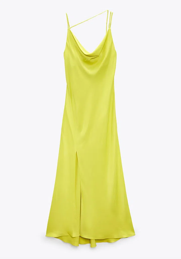 Zara即将推出一系列色彩鲜亮(荧光色调),材质飘逸的夏日新款。其中包括各种shirt dresses及线条优美的吊带裙装。比如这款高开叉的黄色吊带裙,既能展现你漂亮的直角肩,还能秀出美腿。