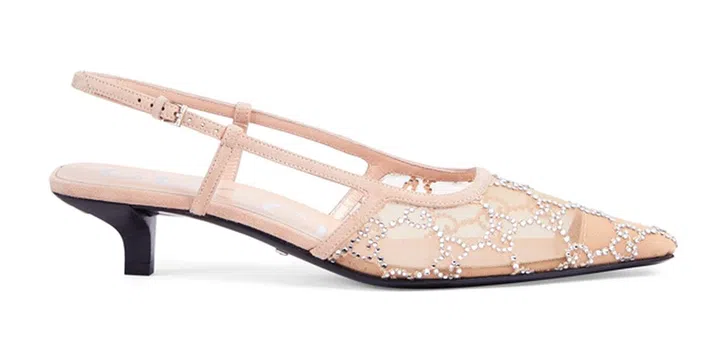 Gucci Aria系列汲取了1990年代和2000年代早期的设计,灵感源自Tom Ford的Gucci时代。系列设计展现出迷人的女性细节,如蕾丝、水晶和透明面料。比如这双猫跟鞋,也是以闪闪发光的GG图案装饰浅玫瑰色网纱面料。