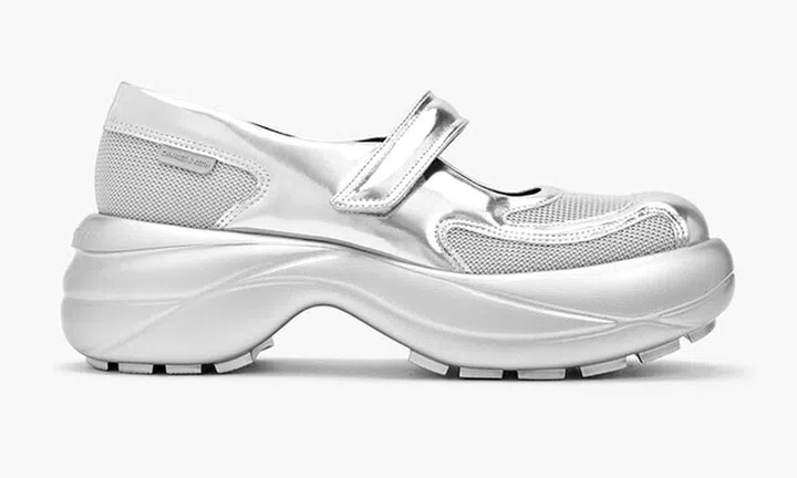 这款银色调的厚底鞋,则是玛丽珍鞋和球鞋的结合。不仅符合时下的流行趋势,其6.5cm的鞋跟走起来也轻便舒适。