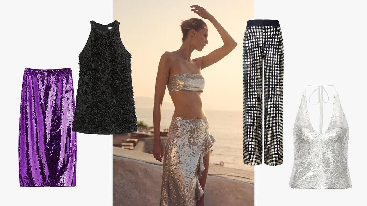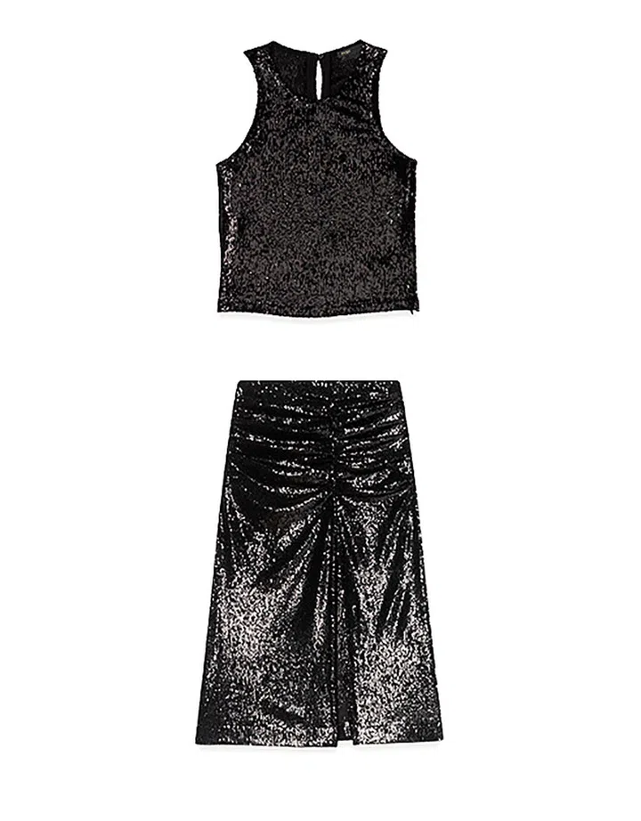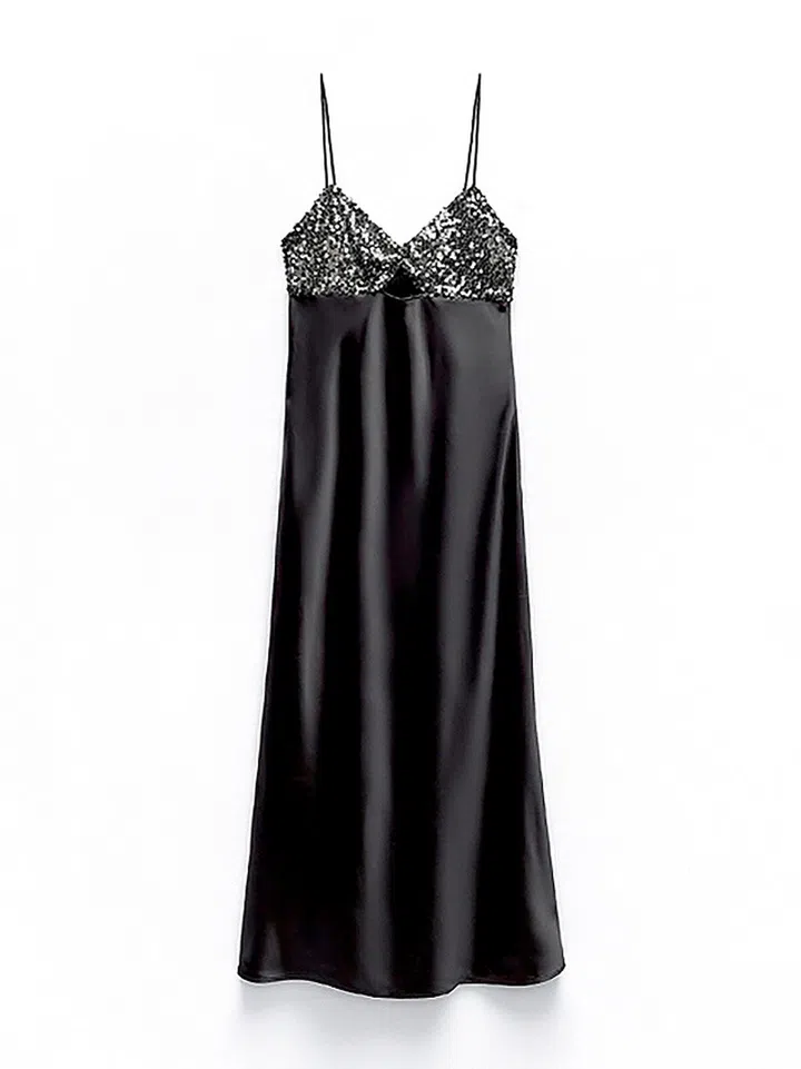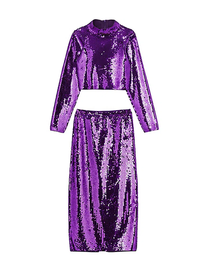 黑色亮片两件套(上衣和裙装)是派对上的经典之选,永不过时。此外,两件套的设计提供了一定的灵活性,既可以搭配成套穿着,也可以与其他单品混搭,创造不同的造型。