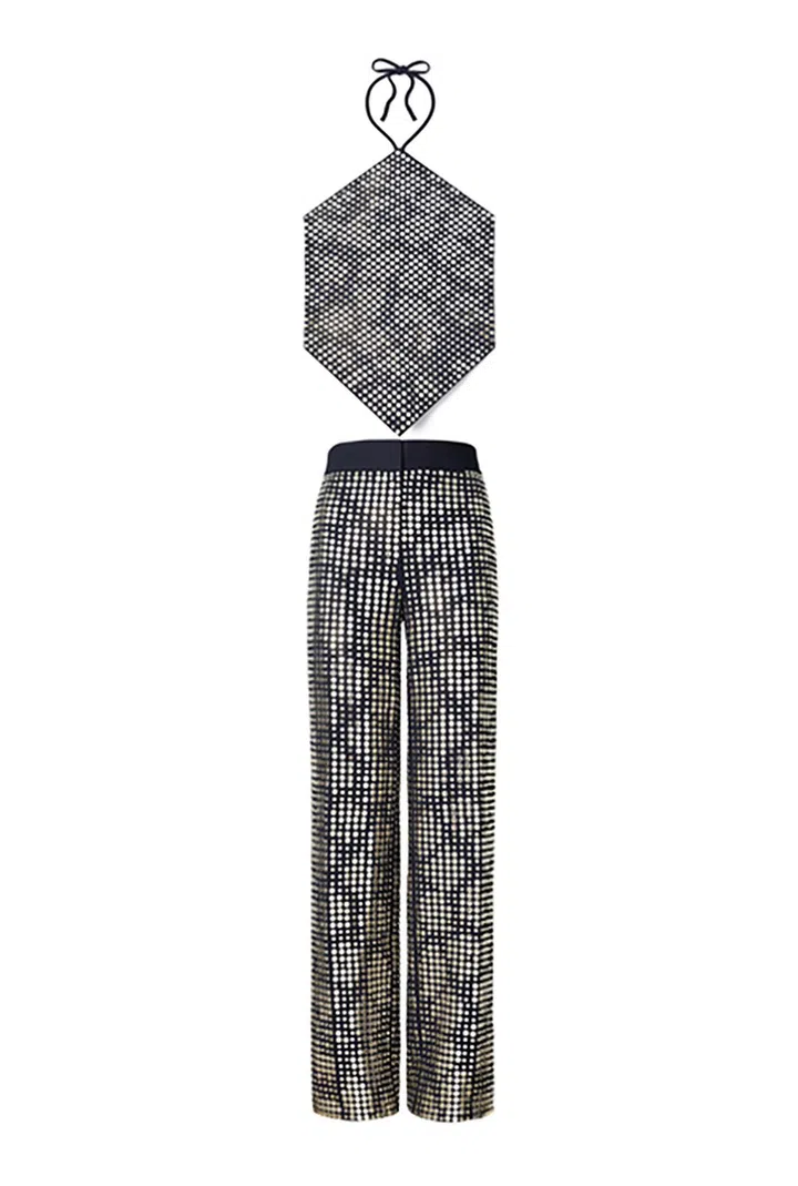 轻盈利落且具都市气质的长裤套装,服装表面装饰醒目缀饰,在派对上方便活动又不失性感气质。