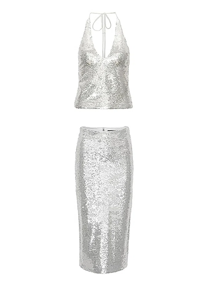 白色调的挂脖上衣覆盖着无数亮片,能够从每个角度捕捉光线。搭配同款亮片铅笔裙,可以完美凸显身材曲线并展现出优雅的整体效果。
