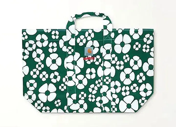 Marni与Carhartt WIP推出的联名系列提袋。包身印有复古可爱的花纹,材质是棉质帆布,轻便易携带,容量空间也超大,从海滩度假日、周末逛街到办公通勤的随身物品都能轻松装入。